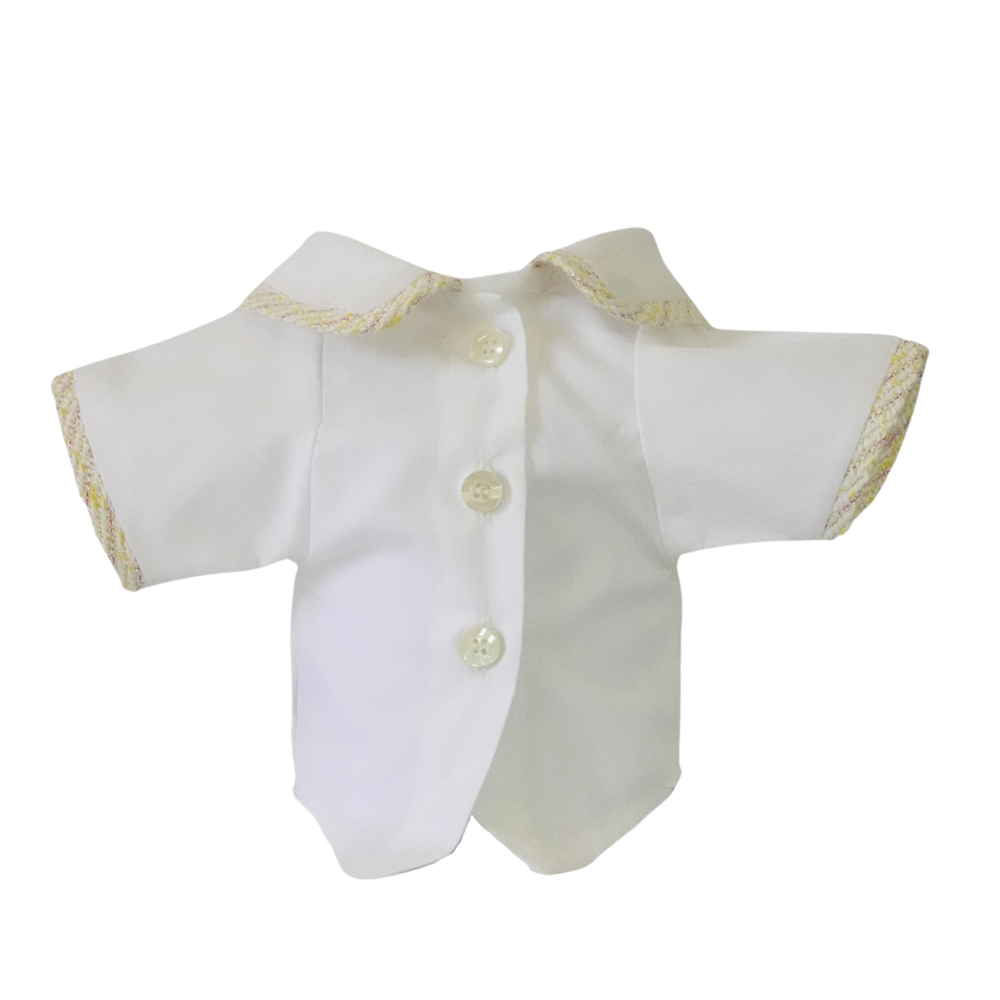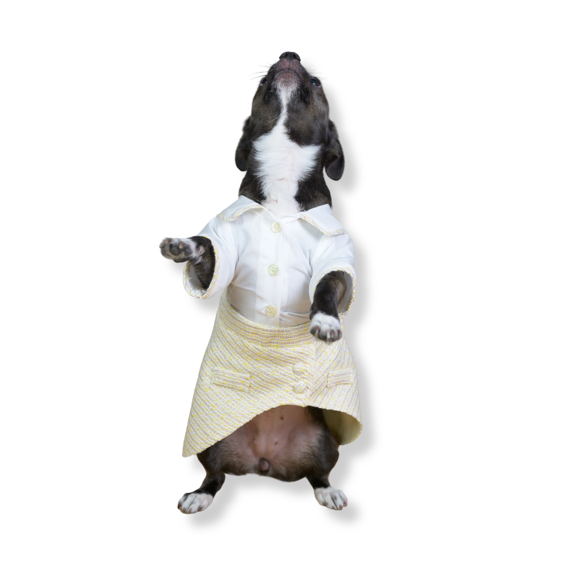 With refined details, sleeves and collar with pastel yellow tweed edge (which recalls the fabric of the jacket and skirt suit).
